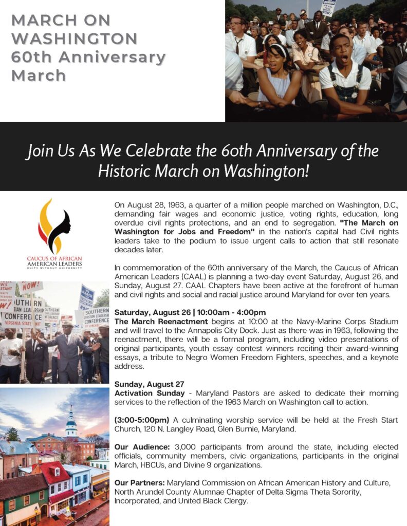The State of Maryland has been invited by the Caucus of African American Leaders (CAAL) in Anne Arundel County to attend the 60th Anniversary Celebration of the March on Washington. In commemoration of this event, the CAAL is hosting a two-day, state-wide event on Saturday, August 26ᵗʰ, and Sunday, August 27ᵗʰ. The event will include a March reenactment, beginning at the Navy-Marine Corps Memorial Stadium in Annapolis on Saturday at 10:00 AM and ending at the Susan B. Campbell Park at the Annapolis City Dock. A program at the City Dock will follow the March. On the final day, there will be a worship service at Fresh Start Church in Glen Burnie, MD.