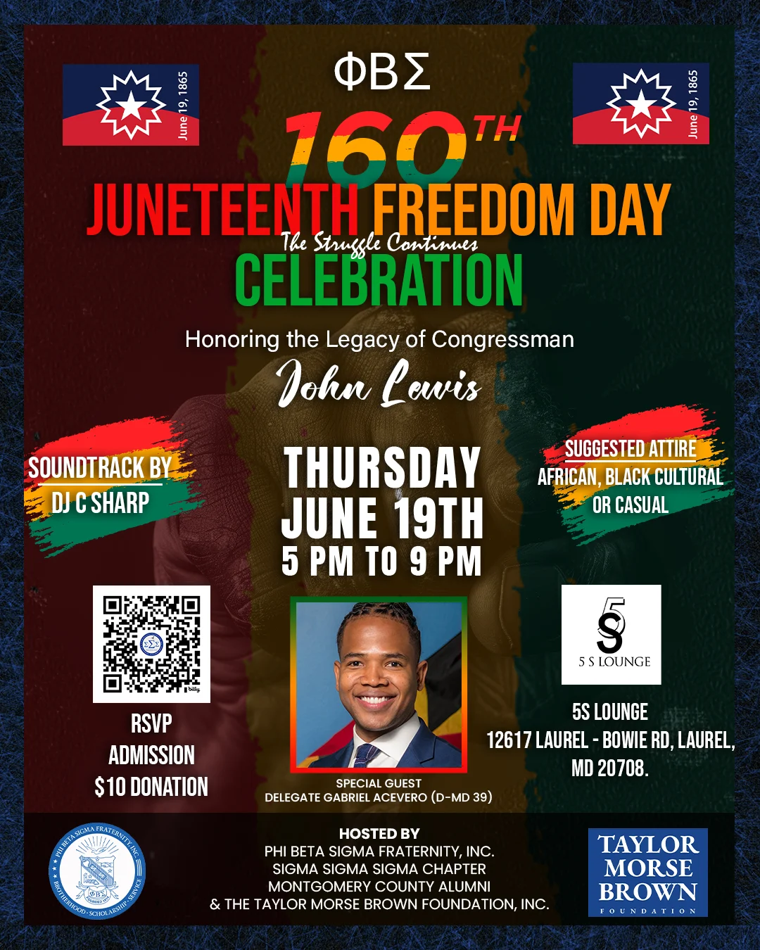 Phi Beta Sigma Fraternity, Sigma Sigma Sigma Chapter, in partnership with Taylor Morse Brown Foundation, Inc. will host a phenomenal Juneteenth Celebration! Proceeds from this event will benefit the Taylor Morse Brown Foundation’s John Lewis Good Trouble Scholarship. Juneteenth, an annual remembrance of the end of slavery in the United States following the Civil War, has been celebrated by African Americans since the late 1800s. This year will commemorate the 160th Anniversary of Juneteenth. The evening consisted of networking, music by DJ DC, cash bar, light fare and a true reflection of our ancestors who fought and paved the way for our freedom. We will have comments from local and national legislative representatives. 🗓 Date: 06/19/2025 from 5 to 9 PM 📍 Location: 5S Lounge, 12617 Laurel-Bowie Rd, Laurel, MD 20708 How Much: $10.00 Donation Live music, great food, and history—let’s celebrate freedom together! RSVP your attendance at: https://bit.ly/2025JuneteenthFreedomDay By the numbers: In 2024, over $3,500 Spent at Mr. Braxton’s Bar & Kitchen Supporting our Black Spend Initiative In 2024, we raised $1,545 to support Taylor, Morse, and Brown Scholarships Over 100 in attendance and exceeded our goals for Brothers in Attendance |